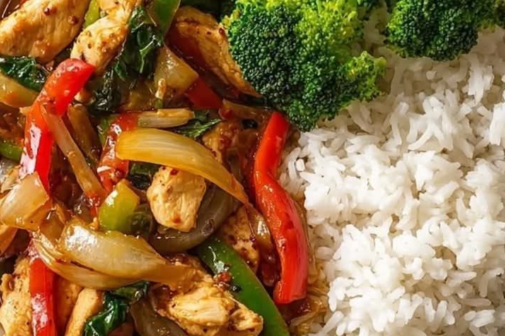 Cook the rice in salted water until soft and fluffy, about 15 minutes. While the rice cooks, steam broccoli until bright green and tender-crisp. Heat oil in a large skillet or wok over medium-high heat. Add garlic and chicken strips, stir-frying for 4–5 minutes until golden. Toss in onions and peppers, stir-fry another 4–5 minutes. Stir in soy sauce, oyster sauce (if using), and chili flakes. Cook another 1–2 minutes until everything is well coated and flavorful. Serve with rice and steamed broccoli.