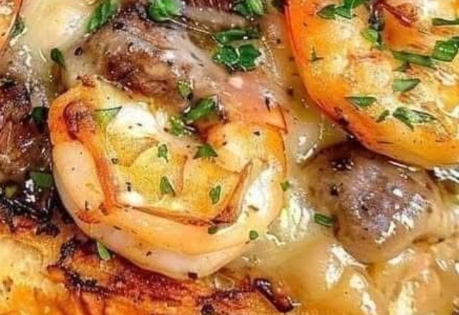Preheat oven to 375°F (190°C). Hollow out the bread, fill with the steak and shrimp mixture. Place on a baking sheet.