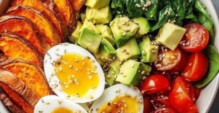 - Arrange lettuce on a plate. Top with avocado, tomatoes, steak, eggs, bacon, and red onion.