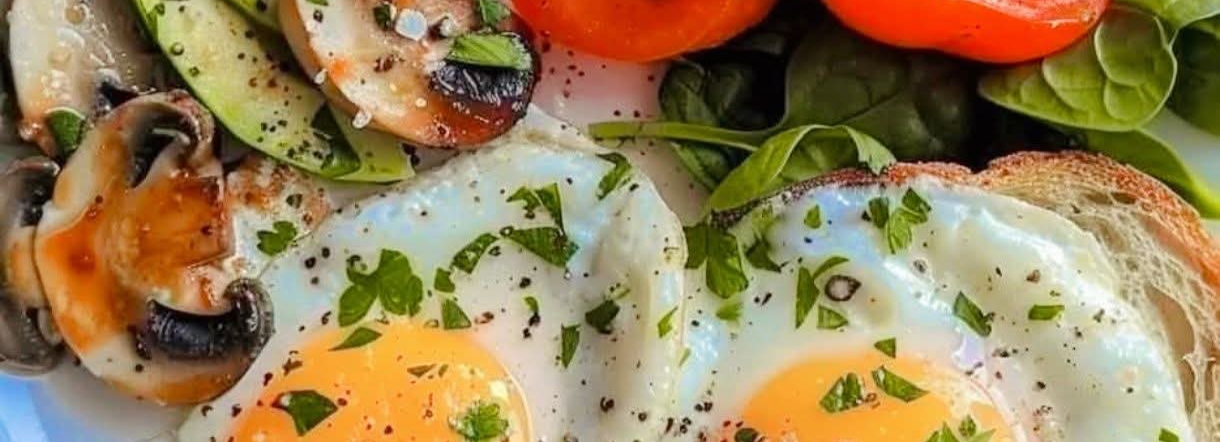 - Assemble plate – place toasted bread with fried eggs on the side. Arrange avocado slices, fresh spinach, sautéed mushrooms, and tomatoes.