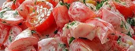 - Cut the tomato into large chunks. Then combine the cut tomatoes with the dressing and chopped dill