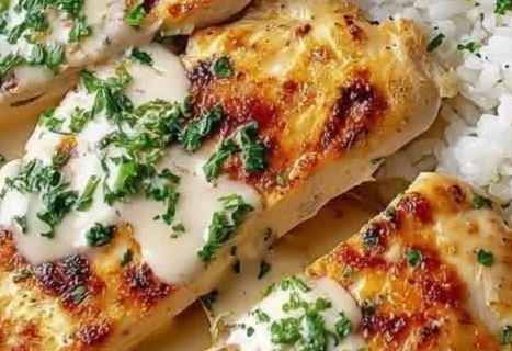 Marinate the chicken in olive oil, garlic, lemon juice, oregano, salt, and pepper for 15 minutes. Meanwhile, toss potato cubes with olive oil, paprika, garlic powder, salt, and pepper, then roast at 200°C (390°F) for 25–30 mins until golden. Grill chicken on medium heat until nicely charred and cooked through. In a saucepan, melt butter, sauté garlic, add cream, lemon juice, mustard, salt, and pepper; simmer for 5 mins until thickened. Plate the chicken with creamy sauce over rice, garlic potatoes, steamed broccoli, and garnish with parsley and lemon wedges.