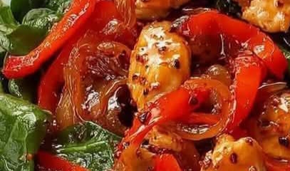 Sauté chicken with garlic and bell peppers in olive oil. Once cooked, coat in a sweet-savory honey mustard soy glaze. Serve over a bed of spinach with rice and fresh tomatoes on the side for a refreshing finish.